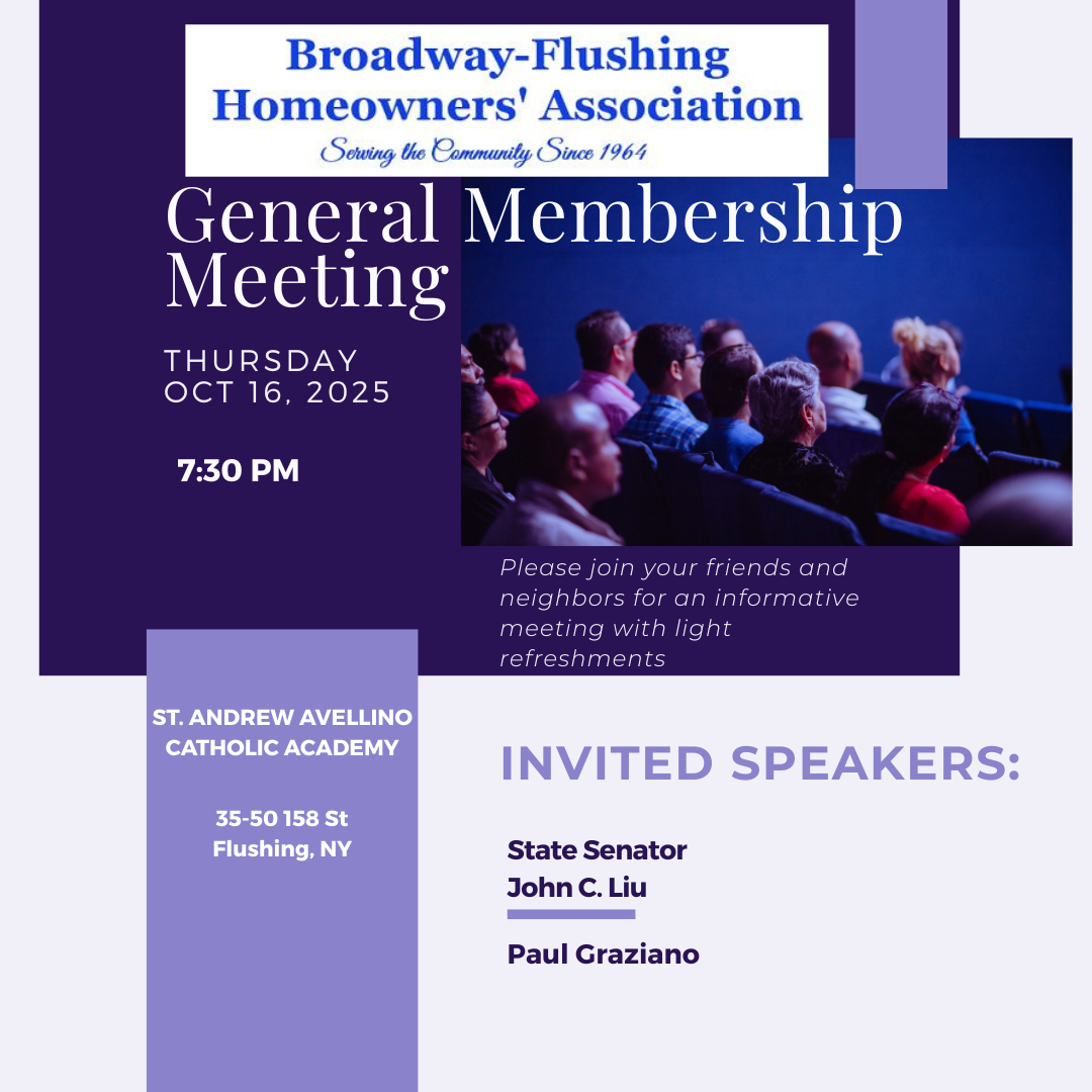 Our next General Membership meeting will be Thursday, October 17 at 7:30pm at St. Andrew Avellino Cafetera on 158th Street between Northern Blvd. and 35th Ave.